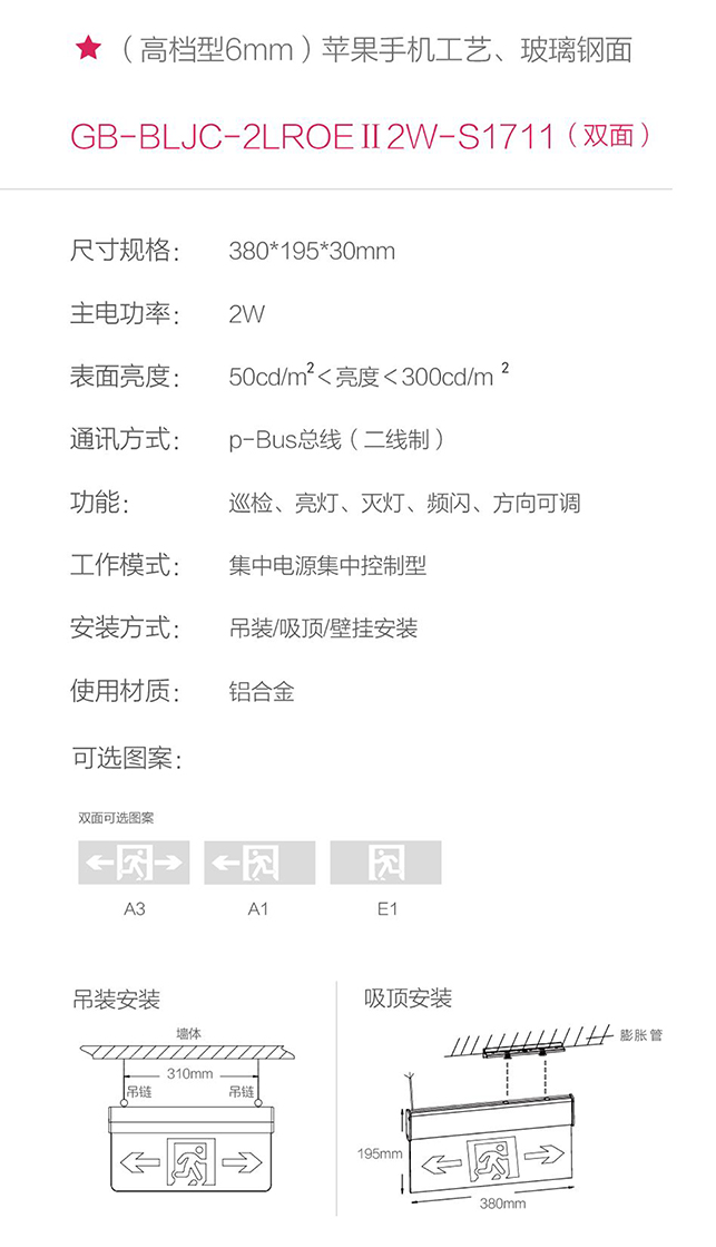 產(chǎn)品型號(hào):S1711主電功率:2W安裝方式:吊裝安裝防護(hù)等級(jí):IP30產(chǎn)品尺寸:380*195*30mm